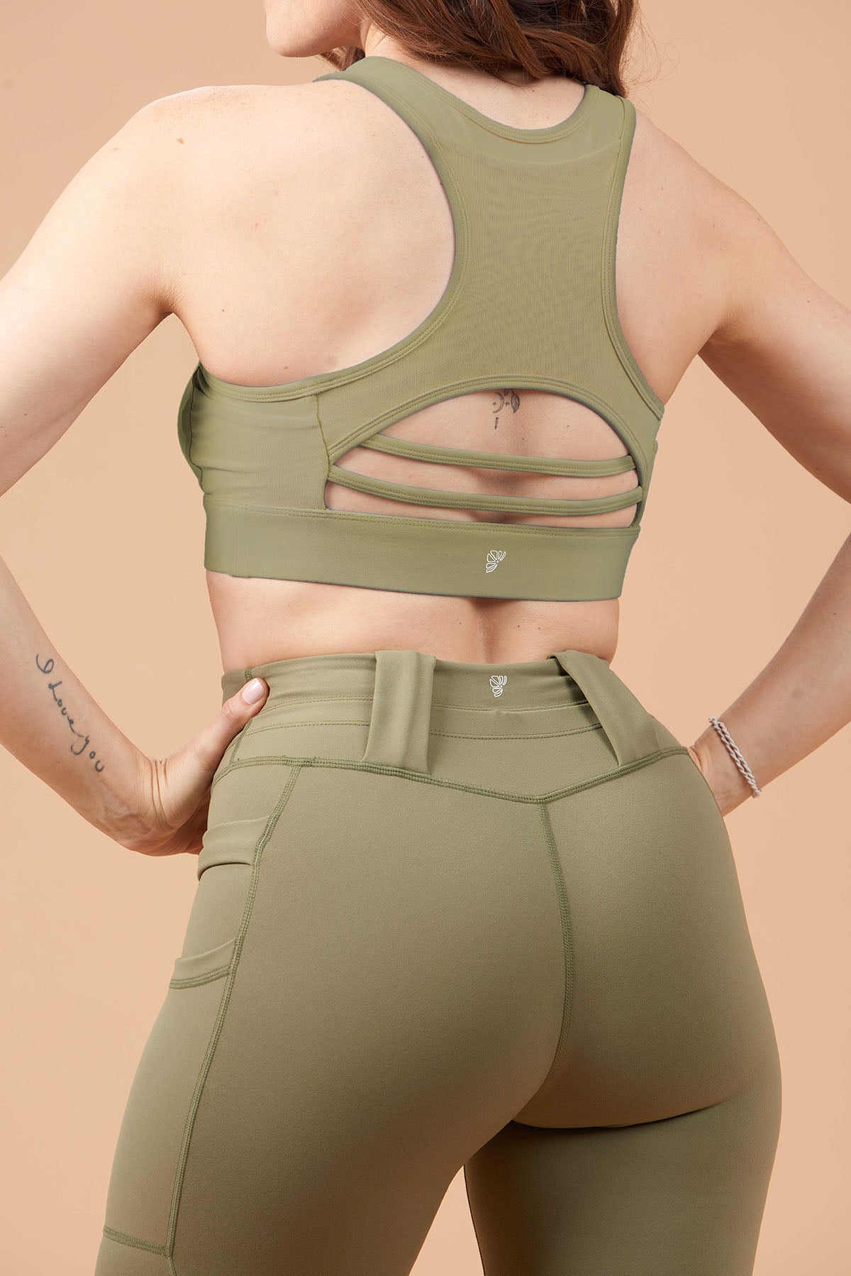The workFORCE bra has a back phone pocket and two side pockets — plus two loops on the front strap for sunnies or your pen.